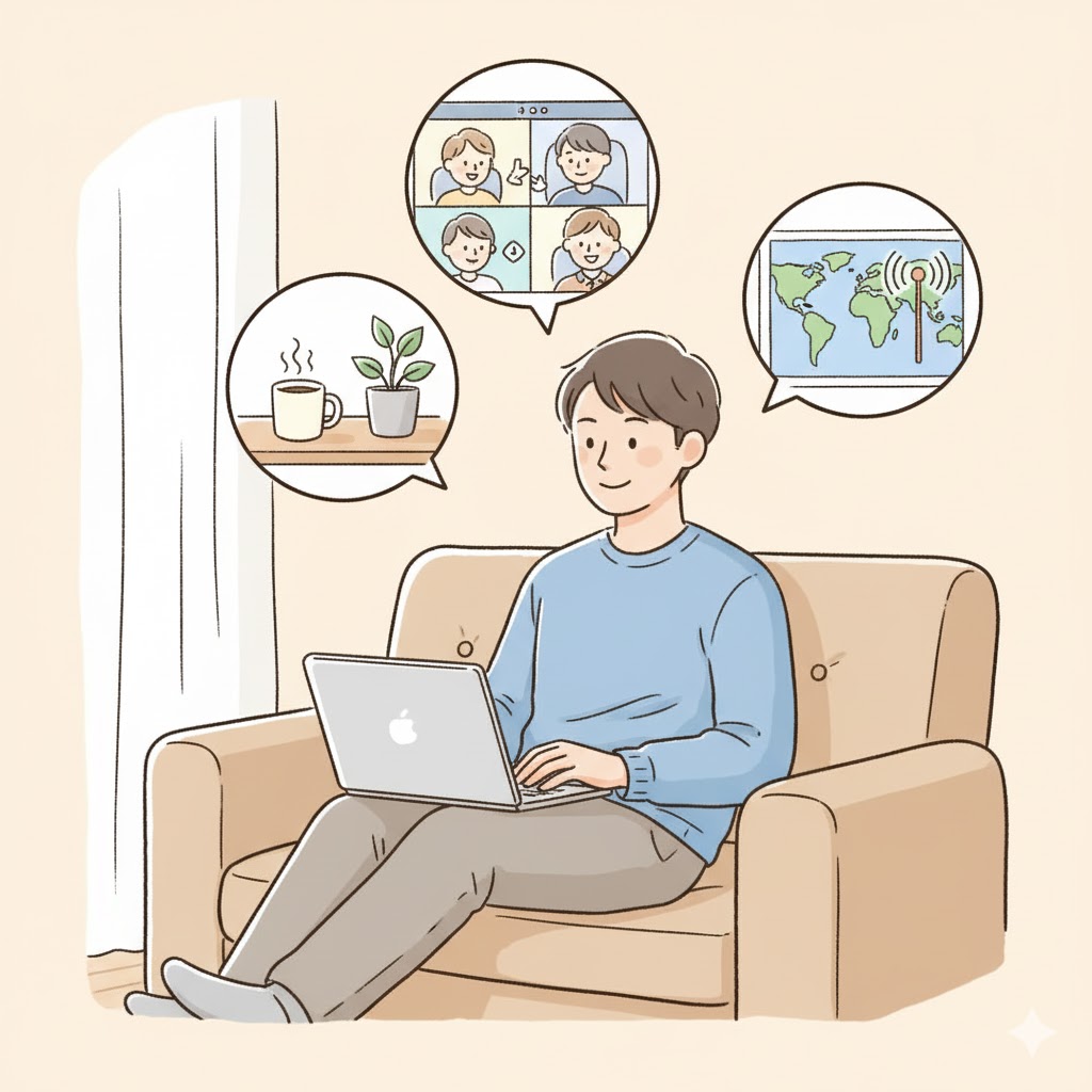 完全リモート型は、オフィス出社が原則不要で、居住地の制限もないケースです。スタートアップやWeb系企業に多く、私が現在働いているのもこのタイプです。メリットは通勤時間ゼロと居住地の自由ですが、コミュニケーション能力と自己管理能力が強く求められます。